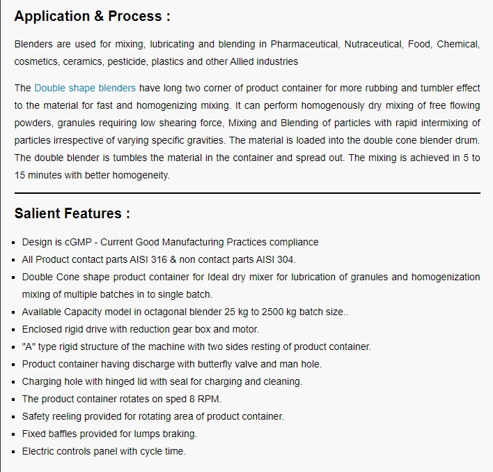 We are a prominent organization in this domain, actively engaged in offering a wide gamut of Double Cone Blender to our respected customer. The offered collections of the products are made from the finest quality raw material in accordance with the industry laid standards under the assistance of the skilled professionals.