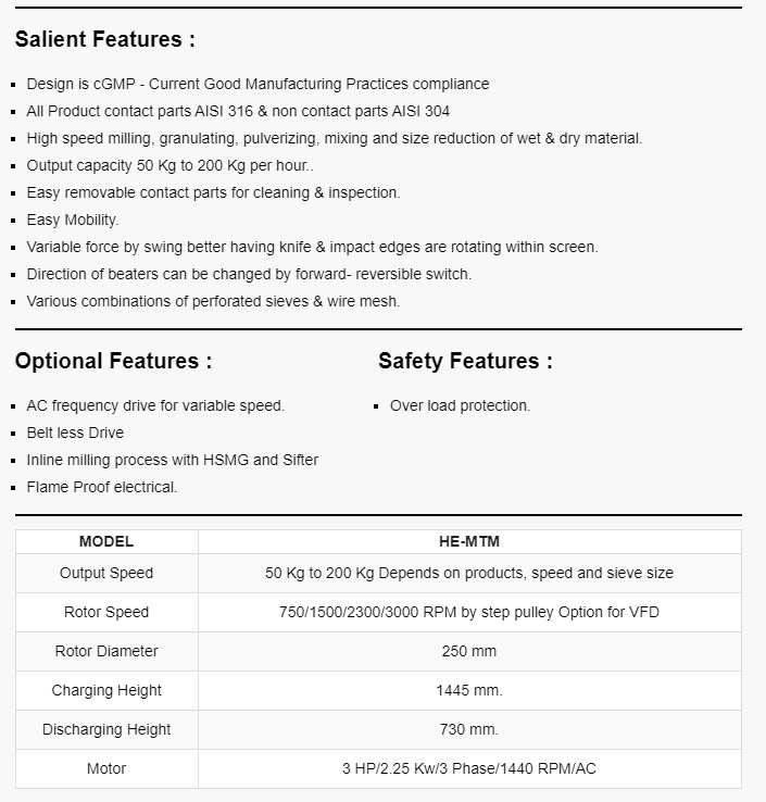 Multi Mill can be used widely for wet & dry granulation, pulverization etc. in various type of applications, such as Pharmaceutical, Cosmetic, Dyes, Colours, Food Products, Spices, Detergents, Insecticides, Plastics & Resins, Fertilizers etc. This portable, self-contained unit is useful for high-speed granulation, pulverizing and mixing of a wide range of wet and dry materials effectively.