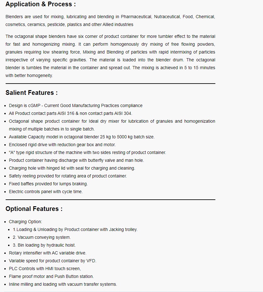 In keeping with our theme of client satisfaction, we are offering Octagonal Blender. Octagonal Blender is considered to be high effective blending machine. It could efficiently mix dry granules and apply lubrication process with ease. This Octagonal Blender is proven for its reliable performance. Owing to its octagonal shape, it could easily process large volume of material in comparison to V and double coned blenders.