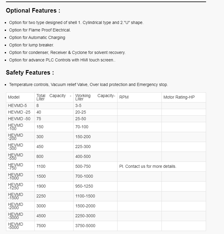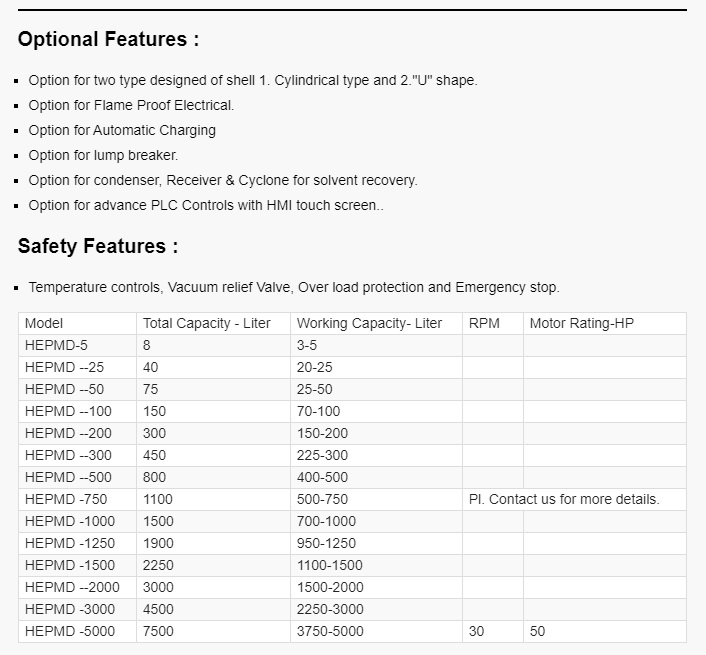 Rotary vacuum paddle Dryer or Paddle Dryer is used to obtain dry Powder from wet cake or solutions. The efficiency is very high and the operating costs are low compared to other types of dryers. It is a closed system in which hot water ,steam, or hot fluid is used as a heating medium in the jacket, in the hollow paddle and in the hallow shaft.