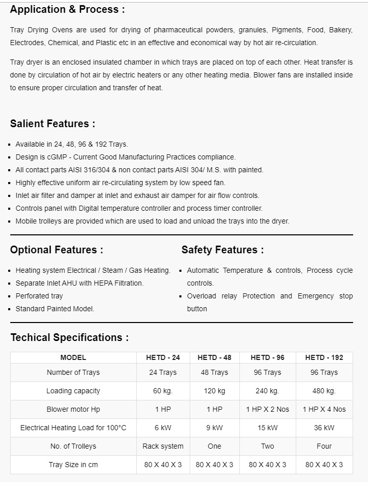 Tray dryer is an enclosed insulated chamber in which trays are placed on top of each other. Heat transfer is done by circulation of hot air by electric heaters or any other heating media. Blower fans are installed inside to ensure proper circulation and transfer of heat. These dryers are used for diverse applications such as Drying of Pigments, Food, Bakery, Electrodes, Chemical, Plastic, Powders etc.