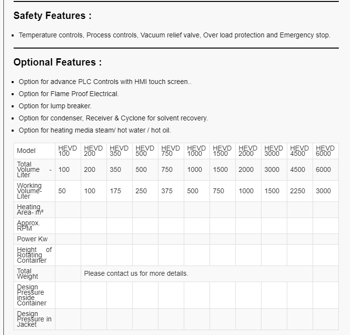 Rotary vacuum paddle Dryer or Paddle Dryer is used to obtain dry Powder from wet cake or solutions. The efficiency is very high and the operating costs are low compared to other types of dryers. It is a closed system in which hot water ,steam, or hot fluid is used as a heating medium in the jacket, in the hollow paddle and in the hallow shaft.